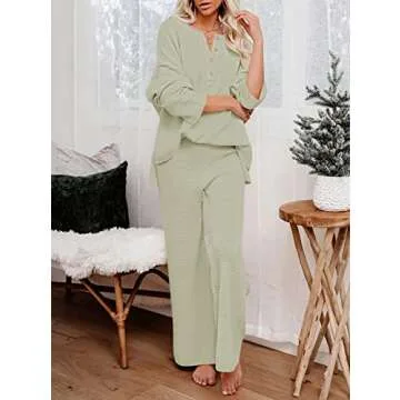 Pink Queen Women's 2 Piece Sweater Set Loose Button Pullover Knit Top Long Wide Leg Pants Sweatsuit Lounge Set Green S