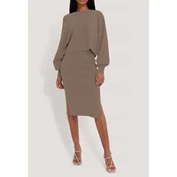 Pink Queen Women's 2 Piece Sweatsuit Sweater Outfit Set Batwing Sleeve Crop Top Wedding Pencil Knit Midi Dress Khaki M