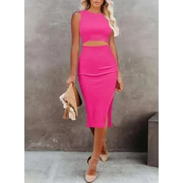 Show more Step into a world of elegance with the Pink Queen Women’s Crew Neck Sleeveless Cutout Side Slit Knee Length Bodycon Knit Midi Dress. This stunning dress, designed in a chic rose red hue, is perfect for the modern woman who loves to flaunt her unique style while maintaining comfort. The dress features a classic crew neck and a sleeveless design that showcases your shoulders, making it an excellent choice for layering during the transitional seasons of fall and spring. The highly stretchy ribbed fabric hugs your curves beautifully, highlighting your silhouette while allowing for easy movement and breathability.