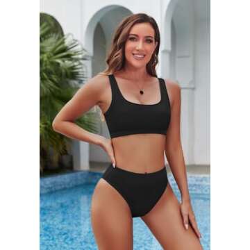 Pink Queen Women's Crop Top Scoop Neck High Waist Two Piece Swimsuit M Black.