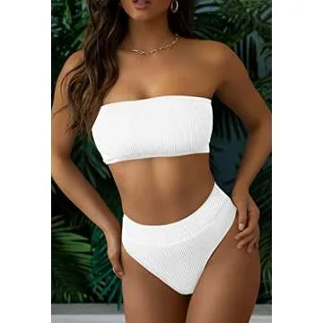 Pink Queen Women's High Waisted Bikini Set 2 Piece Ribbed High Cut Bandeau Swimsuit Bathing Suit White L