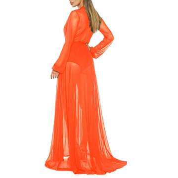 Pink Queen Women's Long Sleeve Flowy Maxi Bathing Suit Swimsuit Tie Front Robe Cover Up Orange L