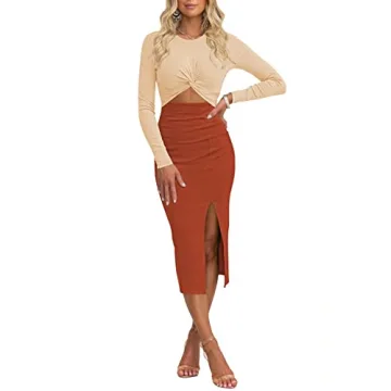 Show more Step into a world of elegance with the Pink Queen Women's Sexy Crewneck Bodycon Long Sleeve Hollow Out Knit Slit Party Pencil Midi Dress. This delightful piece features a unique combination of style and comfort, featuring a classic crew neckline and long sleeves that provide an effortlessly chic look for every occasion. The gorgeous twist ruched hollow-out front design not only flatters your figure but also creates a stunning silhouette that emphasizes your curves, providing a perfect fit for various body types. The plush, ribbed knit fabric enhances warmth during the colder seasons, making it an excellent addition to your fall, winter, and spring wardrobe.