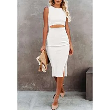 Pink Queen Women's Sexy Sleeveless Bodycon Dresses Crew Neck Party Cocktail Wedding Ribbed Midi Dress White S