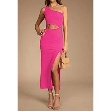 Show moreIntroducing the Pink Queen Women's Summer One Shoulder Bodycon Cutout Dress, a stunning addition to your wardrobe that effortlessly combines elegance and sexiness. Crafted from a soft and highly stretchy ribbed fabric, this midi dress is designed to enhance your lovely curves while ensuring comfort throughout any occasion. The standout features of this dress include a unique one-shoulder design with a removable shoulder strap, providing versatility in styling. With alluring cutouts both at the front and back, paired with a daring side slit, you'll turn heads wherever you go. This dress is perfect for making a statement at summer parties, weddings, or any formal event while maintaining an edge of casual chic.