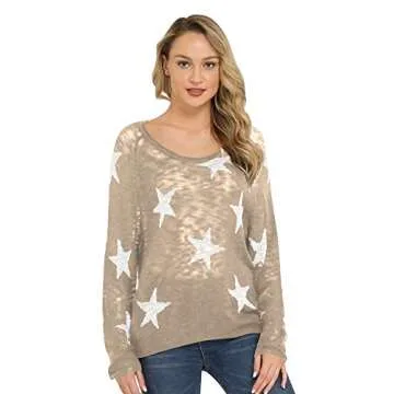 Pink Queen Womens Off Shoulder Sweater Long Sleeve Wide V Neckline Stars Print Pullover S Khaki