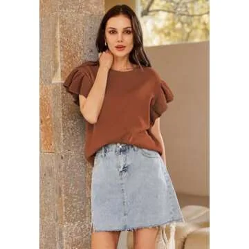 Pink Queen Womens Ruffle Edge Sleeves Tops Casual Crew Neck Loose Fit Knit Lightweight Sweater Pullover Top Chestnut M