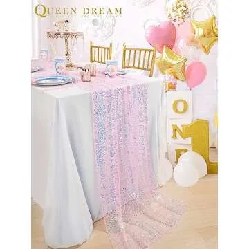 Show more Transform your dining experience with the stunning Pink Sequin Table Runner, an exquisite addition to any table setting that is sure to captivate your guests. This vibrant runner is designed to accommodate tables of 6-10 seats with its impressive dimensions of 25 inches in width and a remarkable 120 inches in length. Crafted from high-quality materials, this runner features shiny 5MM round sequins, giving it an iridescent shine that mimics the enchanting appearance of mermaid scales, making it ideal for themed events. Its durable mesh fabric backing ensures reliability without compromising on elegance.