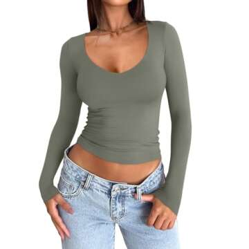 PINKMSTYLE V Neck Long Sleeve Shirts for Women Casual Basic Tops Slim Fit T Shirts Fall Outfits Green Grey X-Large