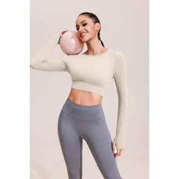 PINSPARK Yoga Tops Workout Crop Tops for Women Long Sleeve Ribbed Shirt Khaki XS