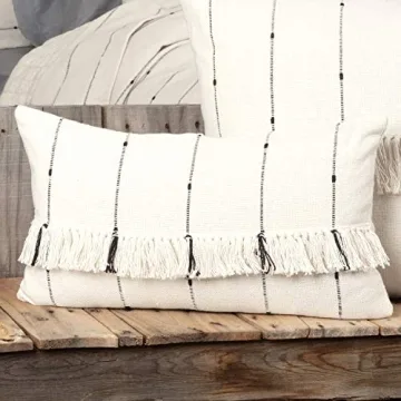 Show moreTransform your living space into a haven of comfort and vintage elegance with the Piper Classics Farmcloth Stripe Pillow Cover. Measuring 12" x 20", this exquisite pillow cover is crafted from 100% cotton, featuring a beautiful warm ivory background embellished with thin black yarn stripes and playful 3" tassels that add just the right touch of style. Its unique design includes intentional "slubs" that enhance its rustic charm while offering a soft hand-feel that invites you to relax. Whether you're embracing a cozy cottage aesthetic or leaning toward an urban rustic vibe, this pillow cover seamlessly blends with any decor.