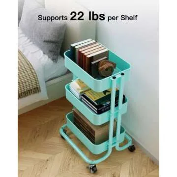 Show moreIntroducing the Pipishell 3-Tier Metal Rolling Utility Cart, your solution to maximizing storage in any room of your home. This multifunctional and stylish cart features a stunning Turquoise finish that not only adds a pop of color but also seamlessly blends with your existing decor. Measuring 16.77” x 13.58” x 29.33”, its compact design allows it to fit effortlessly into tight spaces, making it perfect for kitchens, living rooms, craft areas, and more. Designed with practicality in mind, the cart boasts 3 spacious mesh baskets with interior dimensions of 15.16inch x 11.22inch, ensuring you can organize everything from spices to art supplies with ease. Whether you need a cart for food prep or craft organization, this rolling utility cart adapts to your needs.