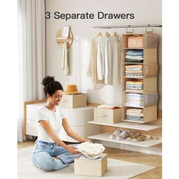 Pipishell Hanging Closet Organizer 6-Shelf, Hanging Shelves for Closet with 3 Removable Drawers & Side Pockets, Hanging Shelf Organizer for Bedroom or Garment Rack, 12'' x 12'' x 43.3'', Beige