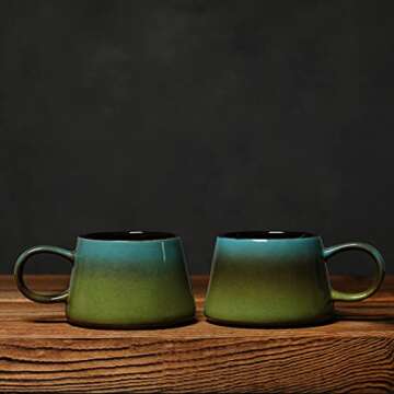Pisten Homme 13 Ounce Glossy Glazed Porcelain Coffee Mugs Set Of 2 With Handle Modern Design Also For Cocoa, Milk, Tea or Water (Turquoise-Olive Green, 2)