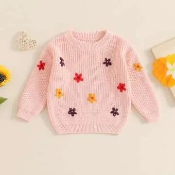 Pivanzore Baby Girl Boy Toddler Knit Sweater Cute Flower Round Neck Long Sleeve Pullover Oversized Sweatshirt Winter Warm Top (Floral Pink, 9-12 Months)