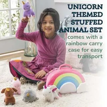 Show more Indulge your child's imagination with our enchanting unicorn stuffed animal set, an exquisite collection designed to bring joy and comfort to every little girl. This delightful set features five soft, huggable plushies including the whimsical Narwhal, Puppycorn, Kittycorn, Rainbow, and Pink Unicorn. Each character is meticulously crafted to provide cuddly companionship, making it perfect for toddlers who adore magical creatures. The 10x8 inches rainbow carry case adds an element of fun and convenience, effortlessly keeping your child's favorite stuffed animals organized while promoting a tidy playtime environment.