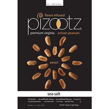 Show moreIntroducing PIZOOTZ Sea Salt Flavor Infused Peanuts, the world’s most incredible, edible peanuts! Created by a rocket scientist, these premium Virginia gourmet peanuts are not your average snack. Packed with flavor and nutrition, each bite delivers a satisfying crunch and a burst of deliciousness. Whether you're at home, at work, or on the go, PIZOOTZ is the perfect healthy snack option that caters to all taste buds. With all-natural ingredients including peanuts, sea salt, and water, you can enjoy these guilt-free snacks that are gluten-free, kosher, and vegan!