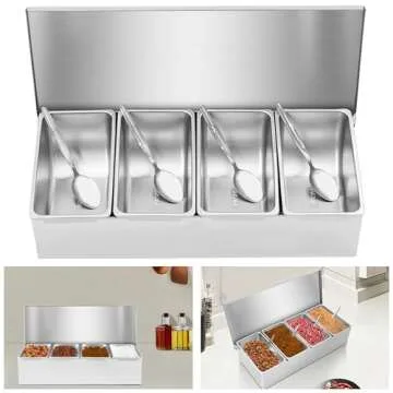 Show moreIntroducing the Pizza Topping Station with 4 Pans, Spoon, and Lid – the ultimate solution for organizing your favorite toppings and condiments! This high-quality stainless steel condiment dispenser is designed to withstand both low and high temperatures, making it ideal for a wide variety of food items including sauces, spices, salads, jams, and even fruits. Its compact dimensions (14.96 x 6.69 inches) make it the perfect addition to any kitchen countertop or serving station, allowing for maximum use of your tabletop space while keeping everything tidy and within reach.