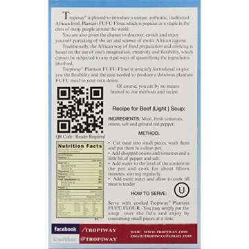 Show moreTropiway Plantain Fufu Flour is a delightful gluten-free alternative that transforms your meals into a delicious and filling experience. Made from high-quality, ripe plantains, this flour retains the rich, authentic flavors you love while providing amazing versatility in the kitchen. With a net weight of 24oz, it’s the perfect companion for soups, stews, or as a standalone dish that adds a unique touch to any meal. Whether you’re looking to savor traditional dishes or innovate new recipes, Tropiway’s flour can help you realize your culinary dreams.