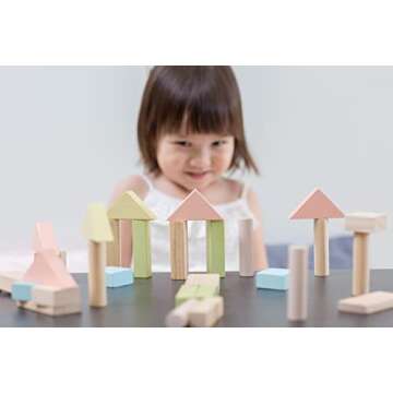Crafted from sustainably sourced, chemical-free rubberwood trees, the PlanToys block set ensures safety and durability with every block handmade using formaldehyde-free glues and water-based dyes. Additionally, the set includes 18 pastel-colored blocks and 22 natural wood blocks for a wonderful tactile experience, allowing children to explore different textures and colors while developing their motor skills.