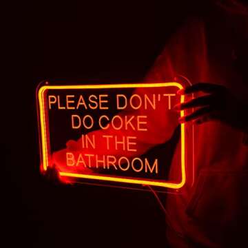 Show moreBrighten up your space with the vibrant Planzo Please Don't Do Coke In The Bathroom Red LED Neon Sign. Measuring at a perfect size of 15.75" x 9.84", this eye-catching piece transforms any bedroom, bathroom, or game room into an exhilarating haven. Its remarkable design combines modern aesthetics with functional LED technology, all powered conveniently via a 6.6ft USB cord with an integrated dimmer switch. Simply plug it into a power bank, phone charger, or computer to illuminate your life in an electrifying way! (Note: this product does not include a power adapter.)