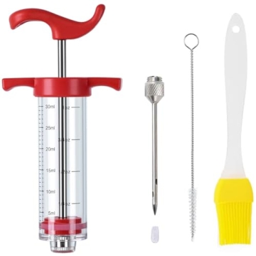 Show moreIntroducing the Ruiwin Meat Injector Kit, a must-have for any culinary enthusiast looking to enhance their cooking game. This comprehensive kit includes a high-quality meat injector syringe, a sturdy meat needle, a cleaning brush, and a silicone oil brush, all beautifully packaged in an exquisite craft paper box. Perfect for aspiring chefs and home cooking aficionados alike, this kit makes injecting marinades into meats a breeze, guaranteeing succulent and flavorful results. The injector is crafted from premium food-grade plastic while the needle is made of durable stainless steel, ensuring safe and direct contact with your favorite seasonings and ingredients.