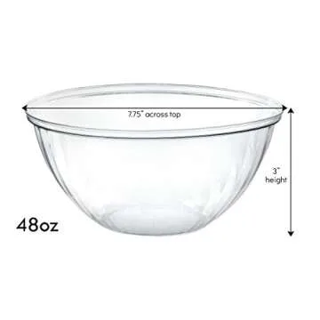 Show more Introducing our exquisite set of 48 oz Round Clear Plastic Party, Salad, and Snack Serving Bowls with Lids. These crystal clear bowls are designed for versatility and convenience, making them perfect for a range of occasions including parties, family dinners, and casual gatherings. Each bowl is made from BPA-free durable plastic, ensuring safety and durability without compromising on quality. The lightweight nature of the bowls makes them easy to handle, while their sturdy design means they can withstand everyday use.