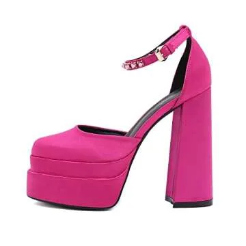 Show more Step into style and elegance with these stunning Chunky Block High Heeled Platform Pumps. Crafted with a high-quality silk saint upper, these pumps not only offer a sleek and classic look but also provide incredible comfort as you move. Standing tall with a heel height of approximately 5.51 inches (14 cm), they create a visually appealing silhouette that makes you look slim and beautiful. The platform design is specially crafted to give you stability while adding that extra height every woman desires.