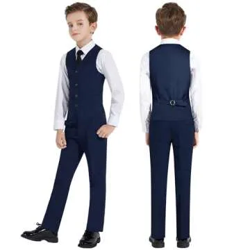 Show more Introducing the ultimate in formalwear for young boys, the Boys Blue Suit 5-Piece set, designed to make every special occasion truly unforgettable. This exceptional ensemble includes a stylish suit blazer, a sophisticated vest, tailored pants, a crisp white shirt, and a coordinating tie. To enhance its versatility, we also provide a charming bow tie and a beautiful pocket square, making this suit suitable for a range of events.