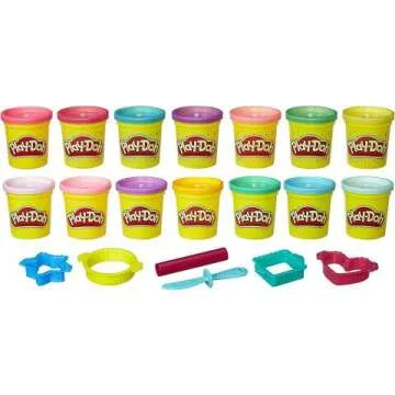 | Included Components | Includes 4 cutters, roller, plastic knife, 8 cans of Play-Doh Brand Modeling Compound, and 6 cans of Play-Doh Sparkle compound (3-ounce cans, 42 ounces total). See more |