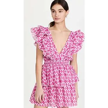 Introducing the Playa Lucila Women's Ruffle Mini Dress, your perfect companion for sunny days and summer adventures! Crafted from lightweight, non-stretch batiste, this dress ensures comfortable wear while showcasing an eye-catching ikat pink print that radiates joy and playfulness. The deep V neckline paired with a stylish back design adds a dash of sophistication, while the layered flutter sleeves and skirt flutter gracefully...