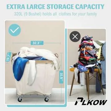 Show more Introducing your new laundry companion—the ultimate solution for organizing your laundry and more! This premium large rolling laundry hamper measures 32.3''(L)x19.7''(W)x31.5''(H) and offers an impressive capacity of 320L (9 Bushels), making it a perfect choice for families. Say goodbye to clutter and chaos and hello to neatness and order!