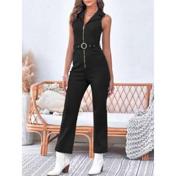 PLNOTME Women's Sleeveless Denim Jumpsuits Zip Up Belted Straight Leg Jeans Long Rompers