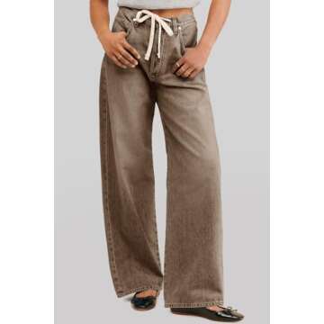 PLNOTME Womens Baggy Wide Leg Jeans Boyfriend Drawstring High Waisted Mom Denim Pants with Pockets