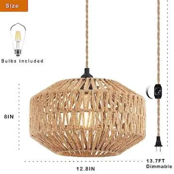 Plug In Pendant Light Hanging Lights With Plug In Cord Rattan Hanging Lamp Wicker Woven Basket Lampshade,Farmhouse Industrial Dimmable Boho Plug In Ceiling Light Fixture For Living Room Kitchen Island