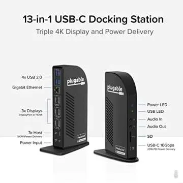 Plugable 4K Docking Station Triple Monitor with 100W Power Delivery, USB-C Dock for Thunderbolt and USB-C Windows and Mac M1 M2 M3, Driver Required (3X HDMI, DisplayPort, 1x USB-C, USB 3.0, SD Card)