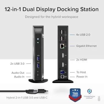 Show moreExperience the ultimate in workspace efficiency with the Plugable USB 3.0 Universal Docking Station (Model UD-3900). This sleek and versatile docking station is designed to simplify your tech setup, allowing you to connect multiple peripherals effortlessly. With its hybrid design featuring both USB 3.0 and USB-C connectivity, this dock provides a single connection to your laptop while offering dual HDMI outputs for seamless multi-monitor setups. Whether you're working on web applications or managing multimedia tasks, the UD-3900 serves as your one-stop solution for enhanced productivity.