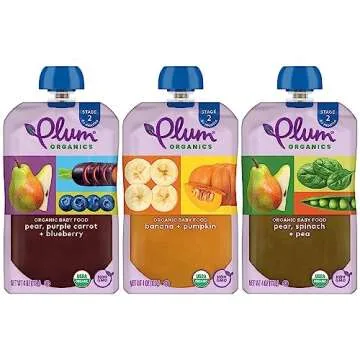 Show more Introducing the PLUM BABY FOOD STAGE 2, a delightful organic food option crafted for babies aged 6 months and older. These conveniently packaged baby puree pouches are designed with busy parents in mind, combining healthiness with convenience for on-the-go snacking. Sourced from natural ingredients, this product features a unique blend of flavors including Pear, Purple Carrot, Blueberry, Banana, Pumpkin, and Pear, Spinach, and Pea blends, all prepared with USDA Organic Certified and Non-GMO standards.
