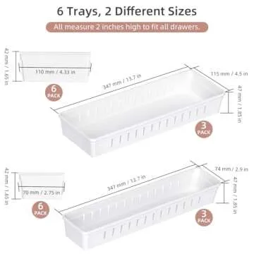Each set includes a total of six pieces—three small trays and three large trays along with twelve dividers and twenty-four non-slip feet. It’s essential to measure your drawer dimensions before purchase to ensure a perfect fit. Your satisfaction is our priority, and if you're not 100% happy with your purchase, our customer service team is ready to assist with returns or refunds!