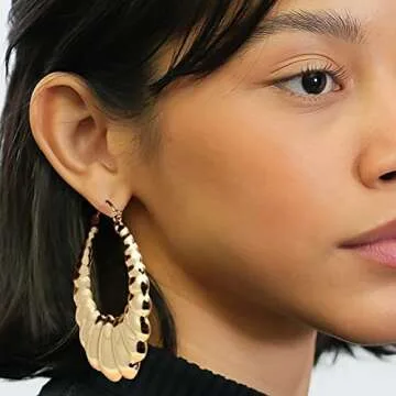 Pnk Trend Gold Plated Scalloped Hoop Earrings for Women-Oval Shaped Shrimp Puffy Hollow Hoop Door Knocker Pin-catch Earrings 50 mm/ 2 inch with Jewelry Box