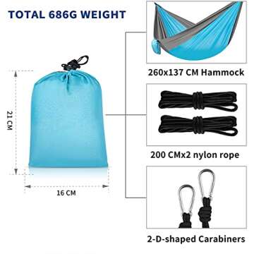 Show more Experience ultimate relaxation with our portable hammock, expertly designed for camping, hiking, backpacking, and more. Made from high-quality heavy-duty parachute nylon fabric, this super lightweight hammock is an adventurer's dream. You can easily hang it on your backpack, and you'll barely feel its weight. When you need to unwind, it allows for a quick escape into nature.