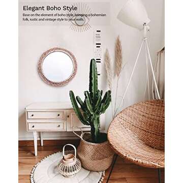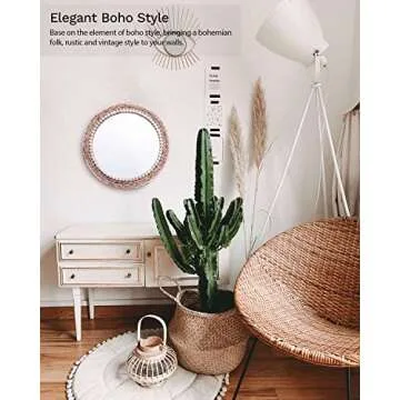 Show more Introducing the Poeme Boho Wall Mounted Round Mirror — a stunning 15-inch decorative masterpiece that effortlessly combines functionality with artistic flair. Crafted with delicate rattan and adorned with charming wooden beads, this mirror isn't just a reflective surface; it’s a statement piece that adds warmth and personality to any space. With a focus on bohemian elegance, the Poeme mirror beautifully complements a variety of interior styles, from rustic to modern chic. Whether you hang it between windows for a practical hair check or use it as a central piece in your boho-themed room, this mirror is crafted to elevate your décor while seamlessly blending into your home’s atmosphere.
