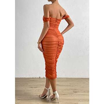The ultimate blend of elegance and allure, this remarkable off-the-shoulder, backless, mesh-ruched bodycon midi dress is crafted from 100% lightweight polyester. As part of a stylish women's collection, it is designed to showcase your unique curves while offering supreme comfort. The soft and stretchy fabric gently hugs your form, ensuring you feel confident whether you're dancing the night away or engaging in delightful conversation.