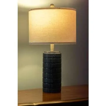 Show more Introducing the exquisite Pokat Table Lamp, a perfect blend of elegance and modern design that will transform your living space. The warm dark blue color encapsulates the essence of classic home decor, allowing it to seamlessly fit into any room in your home. Crafted with a sophisticated ceramic lamp base, this bedside lamp is not just an accessory but a statement piece. Each lamp measures 23 inches in height with a 5-inch diameter, making it an ideal fit for nightstands, end tables, and console tables.