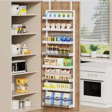 Show more Introducing the POKIPO Over the Door Pantry Organizer, an innovative 8-tier storage solution designed to elevate your home organization! This versatile wall-mounted storage rack not only maximizes your pantry space but also integrates seamlessly into your bathroom and kitchen. Constructed from heavy-duty metal, this organizer is built to last, ensuring your essential items such as spices, snacks, and even beverages are always at your fingertips. With its clean white finish, it adds a touch of modern elegance to any decor while maintaining practicality in a busy household.
