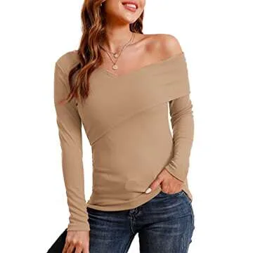 POKWAI Womens Tops Casual Long Sleeve Cross V Neck Off Shoulder Tops Ribbed Knit Fit Shirts Blouse(Khaki,Medium)