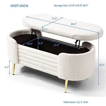 Show moreIntroducing the Polibi Multifunctional Storage Bench, a perfect blend of elegance and practicality that transforms your space into a stylish haven. Upholstered in luxurious, breathable fluffy faux fur sherpa fabric, this end-of-bed bench offers a soft and skin-friendly seating solution, inviting you to sink in and relax. Its unique modern oval shape, combined with smooth corners, adds an element of sophistication, making it an ideal accent piece for any room. Not only does it look stunning with its sturdy metal golden legs, but it also serves a multitude of purposes that enhance your living experience.