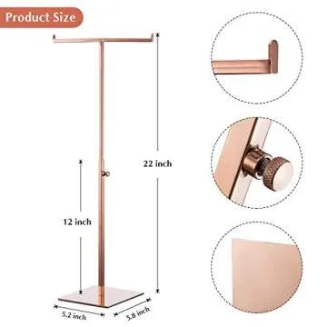 Show moreIntroducing a beautifully designed adjustable T Bar display stand, perfect for showcasing your favorite bags and accessories. Constructed from high-quality stainless steel, this elegant stand features a stunning rose gold finish, ideally complementing various styles of the modern home. With its adjustable height, ranging from 12 inches to a generous 22 inches, it can easily accommodate a diverse collection, from smaller handbags to larger totes.