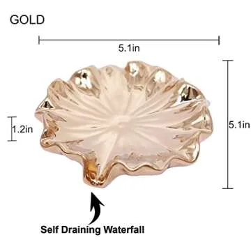 Show moreIntroducing the Polyroyal Lotus Leaf Soap Dish – a perfect blend of style and functionality. This stunning gold ceramic soap holder adds a touch of elegance to your bathroom or kitchen while keeping your space organized and tidy. Its self-draining waterfall design efficiently directs excess water away, ensuring your soap dries quickly and stays fresh. Whether you need it as a soap dish or a sponge holder, its versatile design fits beautifully on the edge of sinks, bathtubs, or counters, making it an essential accessory for any home.