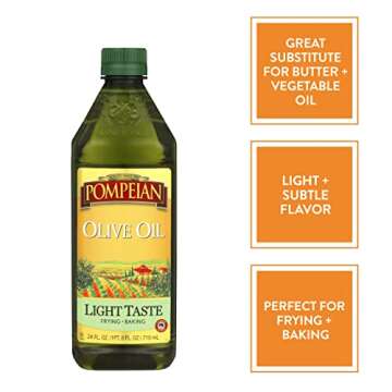Imagine transforming your everyday meals with a simple drizzle of Pompeian Light Taste Olive Oil. Not only does it provide a healthier alternative for your cooking needs, but it also brings a sense of joy and comfort to your kitchen. Whether you’re creating a gourmet salad dressing or baking a delicious cake, this oil's versatility guarantees satisfaction and peace of mind that comes from knowing you’re using a high-quality, natural product. Embrace a healthier lifestyle without sacrificing flavor and make Pompeian an essential part of your culinary tradition.